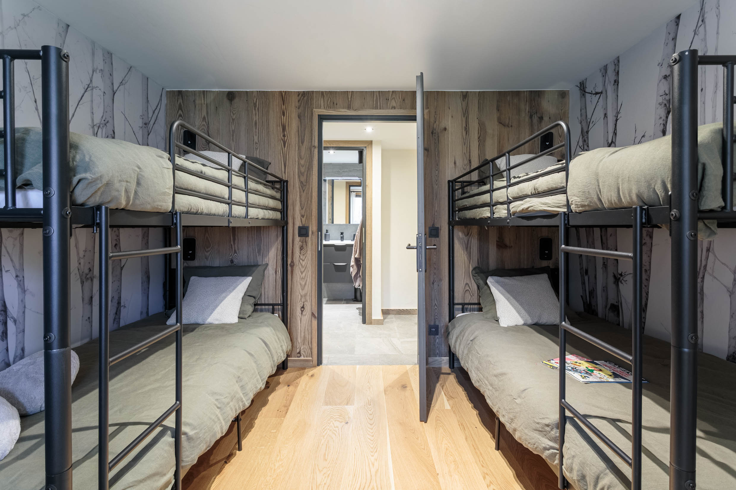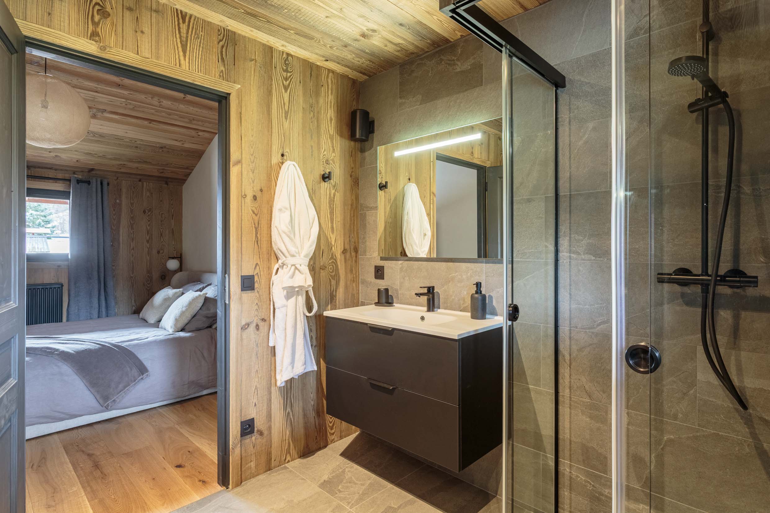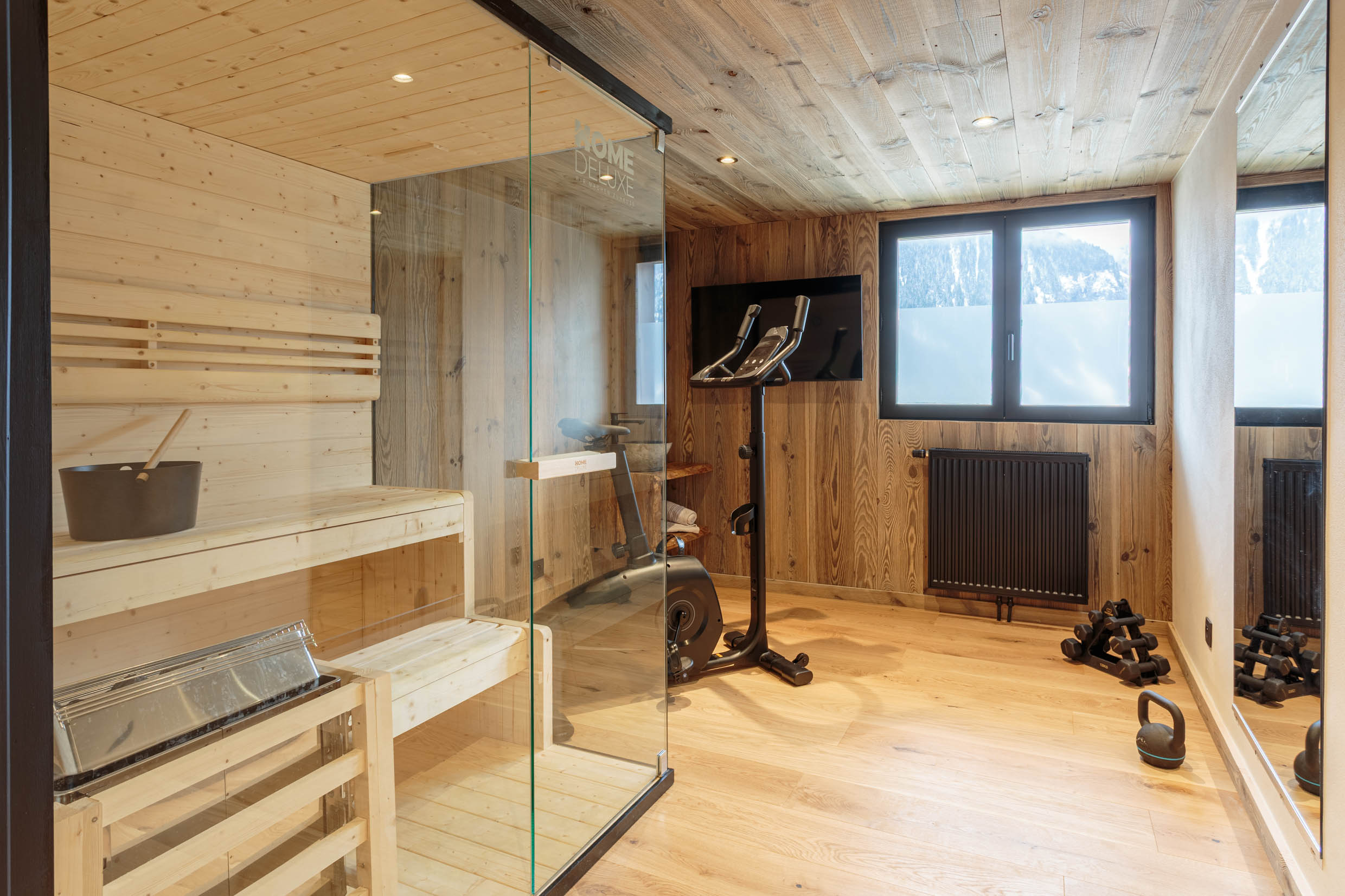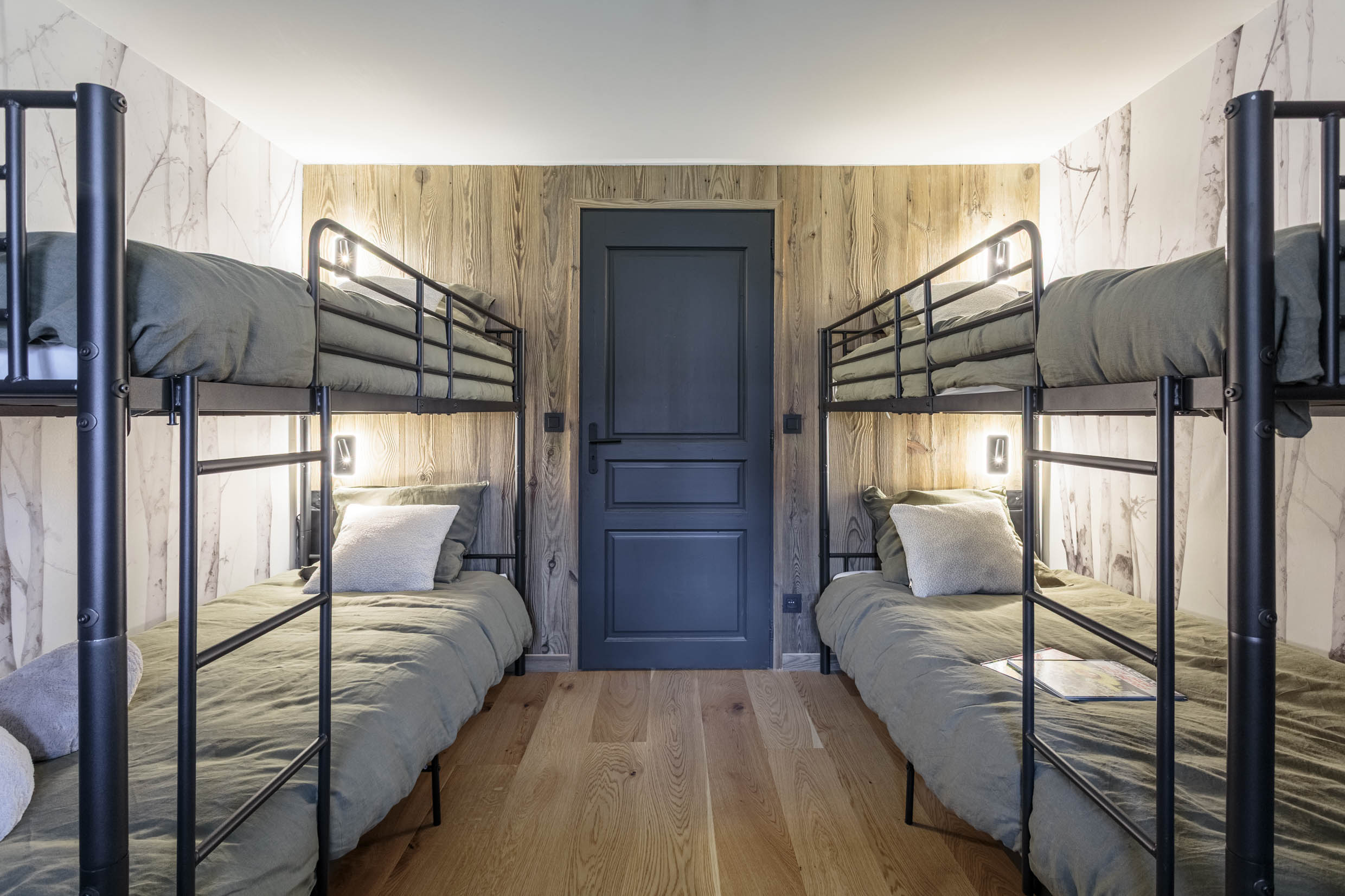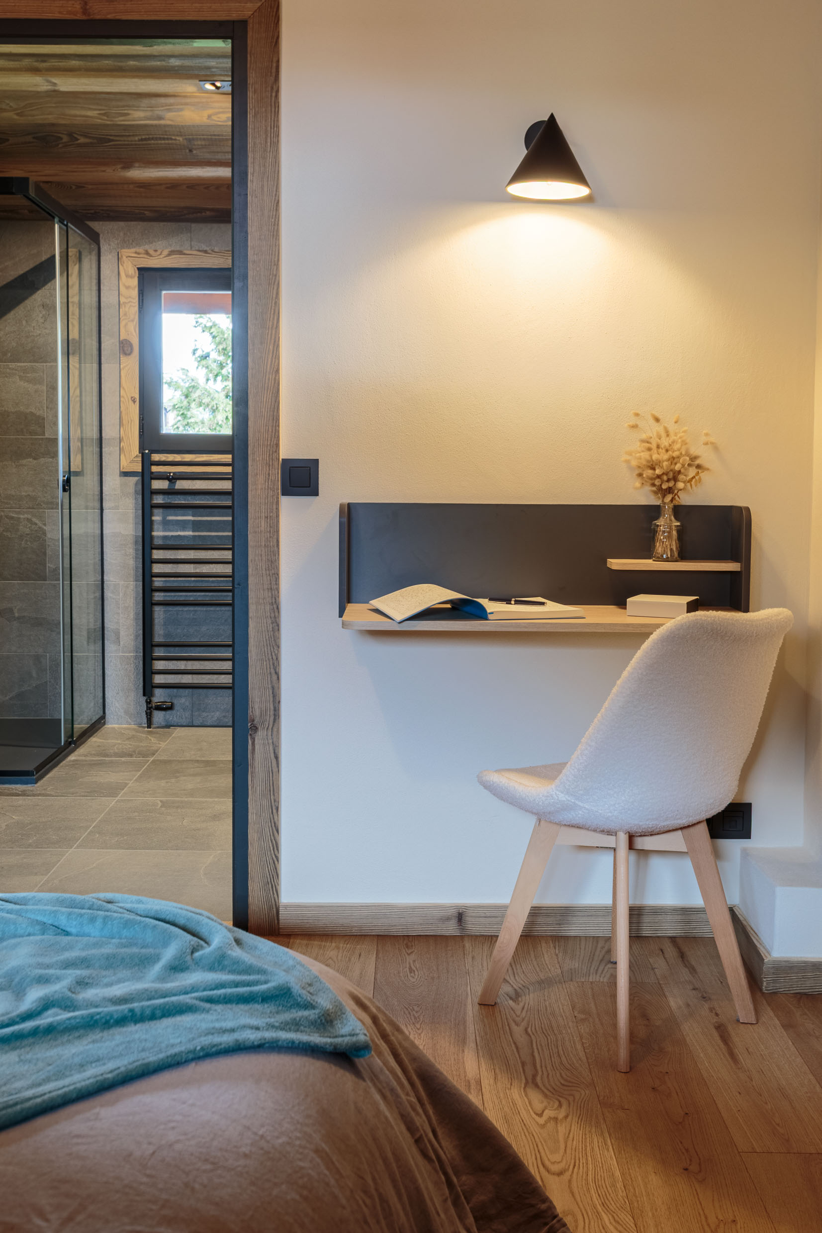 La reconfiguration des espaces redéfinit les usages du chalet. Cinq chambres, chacune accompagnée de sa salle de bains, offrent un confort intime et fluide. En complément, une salle TV, pensée comme un espace plus feutré, une pièce dédiée au bien-être avec sauna, ainsi qu’un skiroom fonctionnel viennent accompagner les rythmes de vie propres à la montagne.