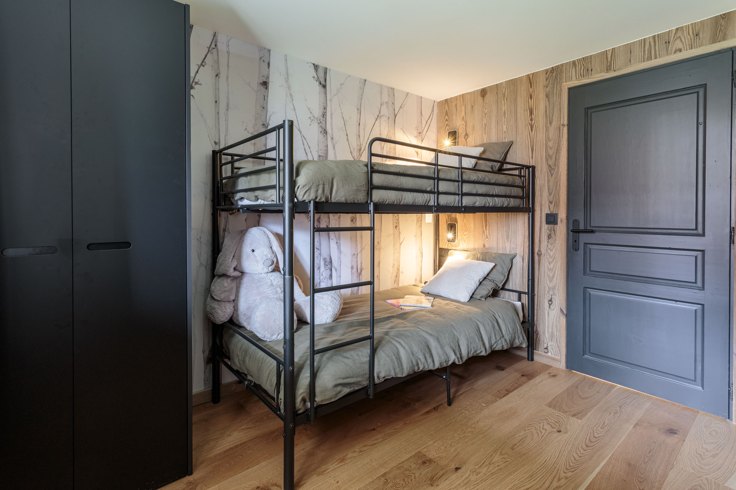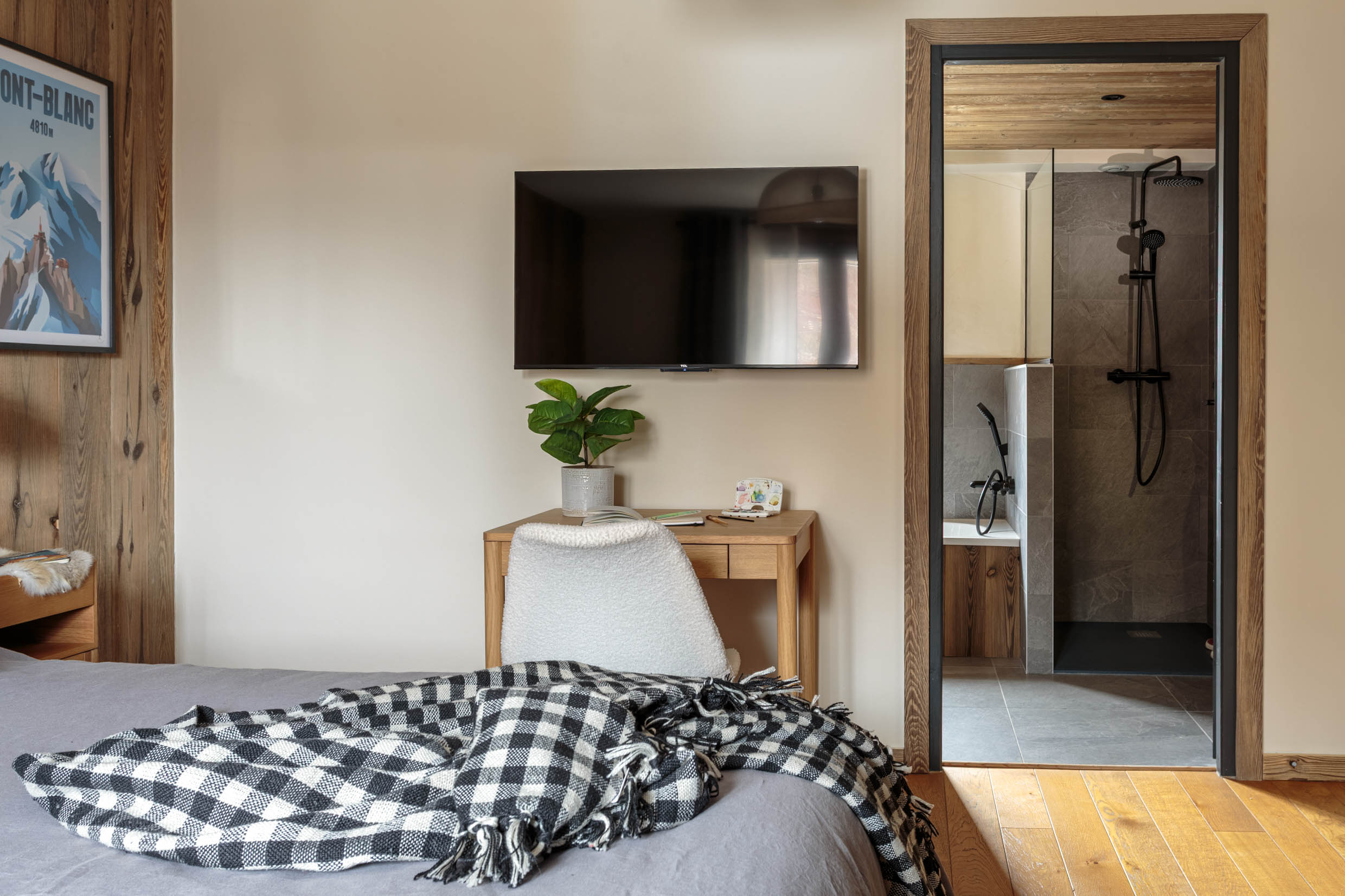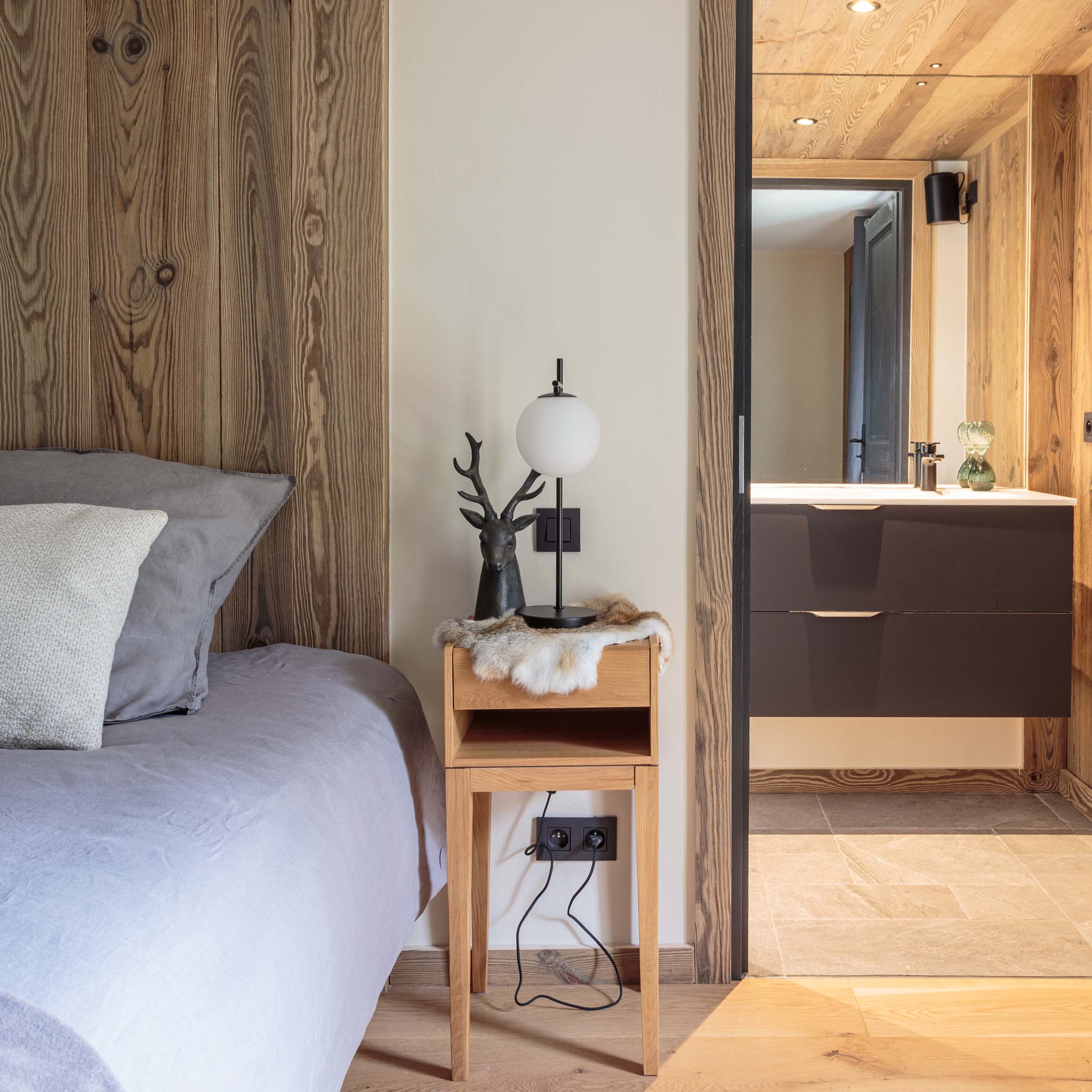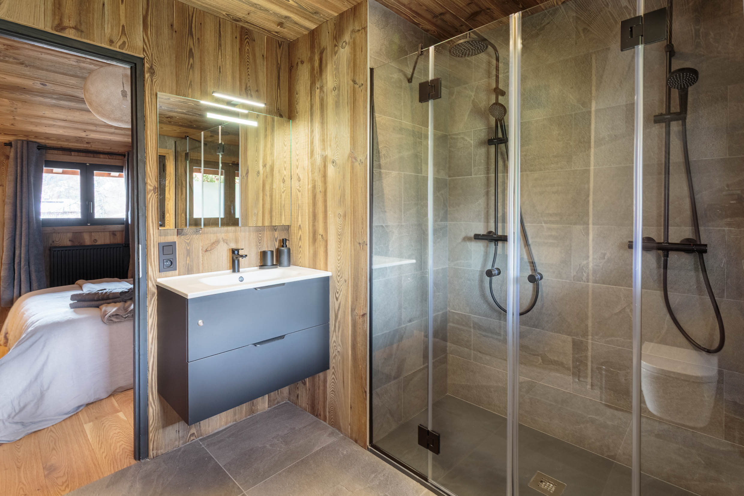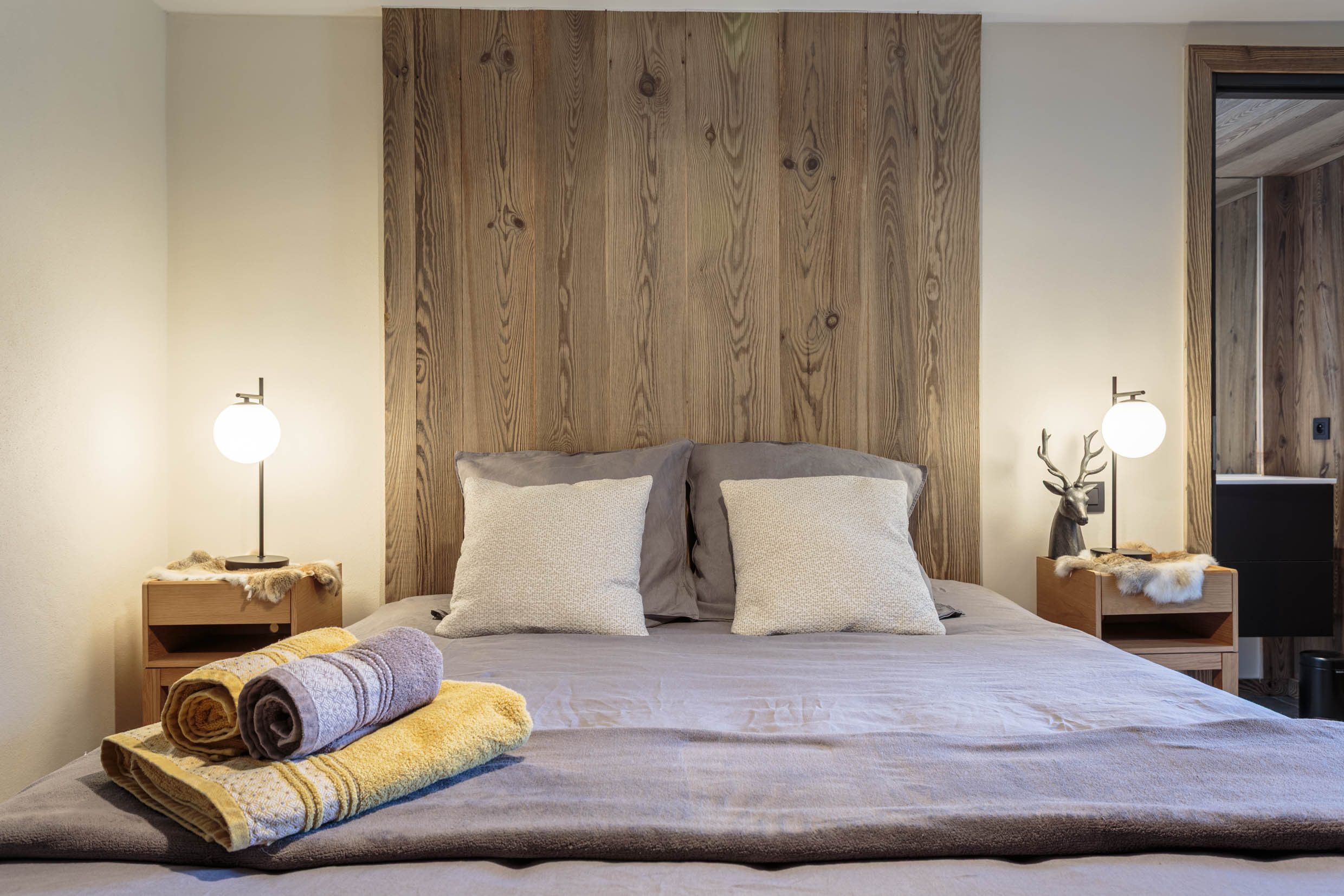 La reconfiguration des espaces redéfinit les usages du chalet. Cinq chambres, chacune accompagnée de sa salle de bains, offrent un confort intime et fluide. En complément, une salle TV, pensée comme un espace plus feutré, une pièce dédiée au bien-être avec sauna, ainsi qu’un skiroom fonctionnel viennent accompagner les rythmes de vie propres à la montagne.