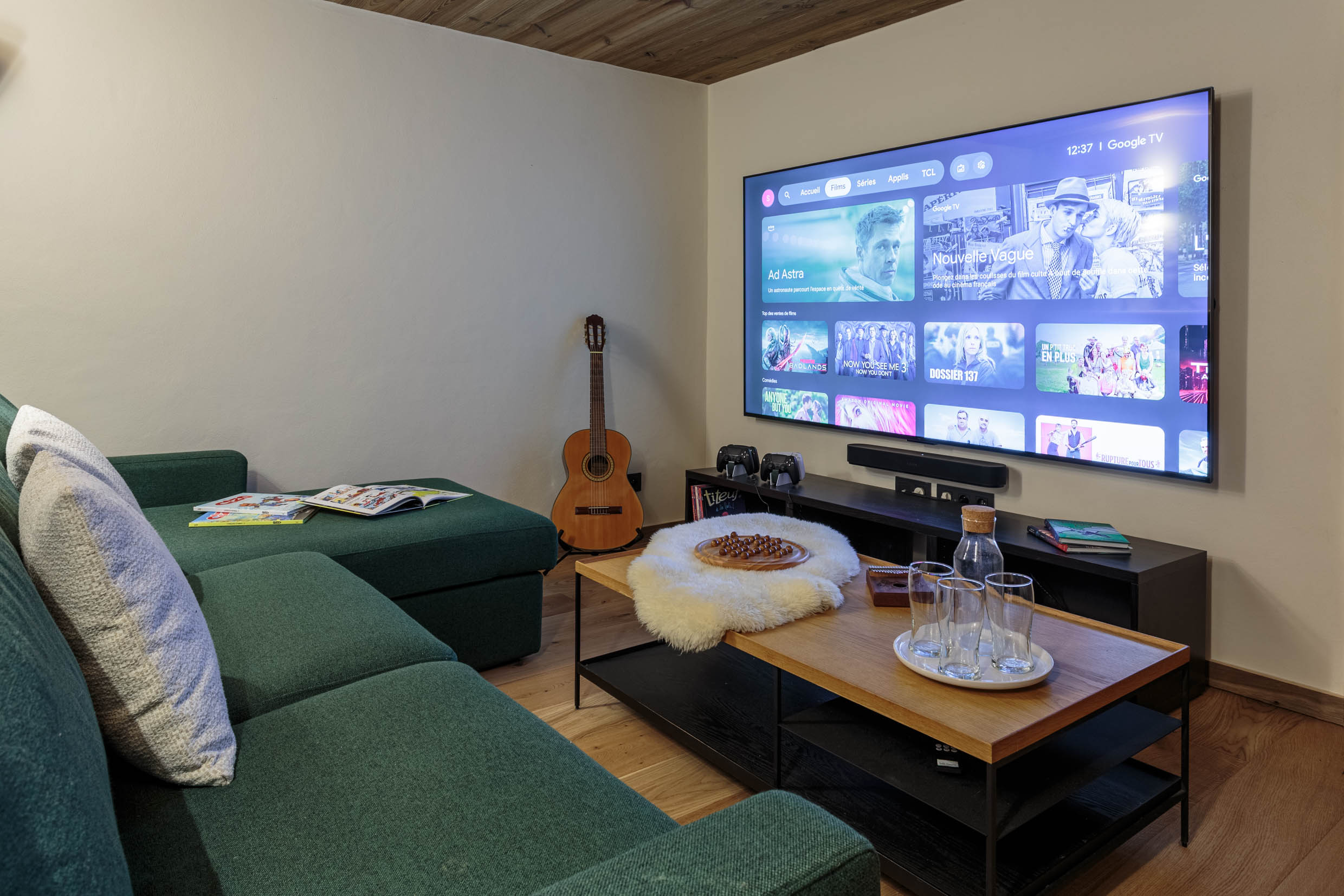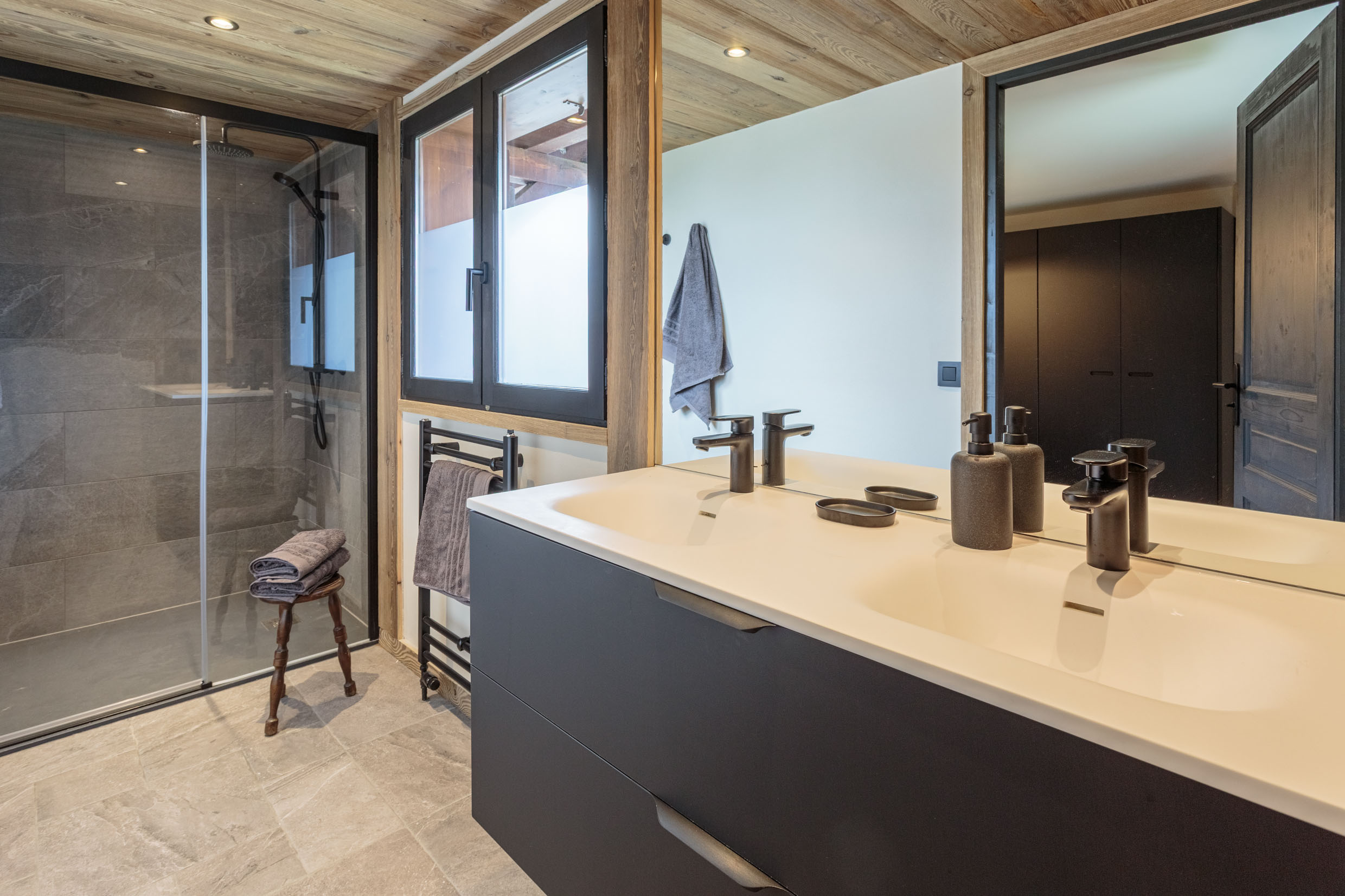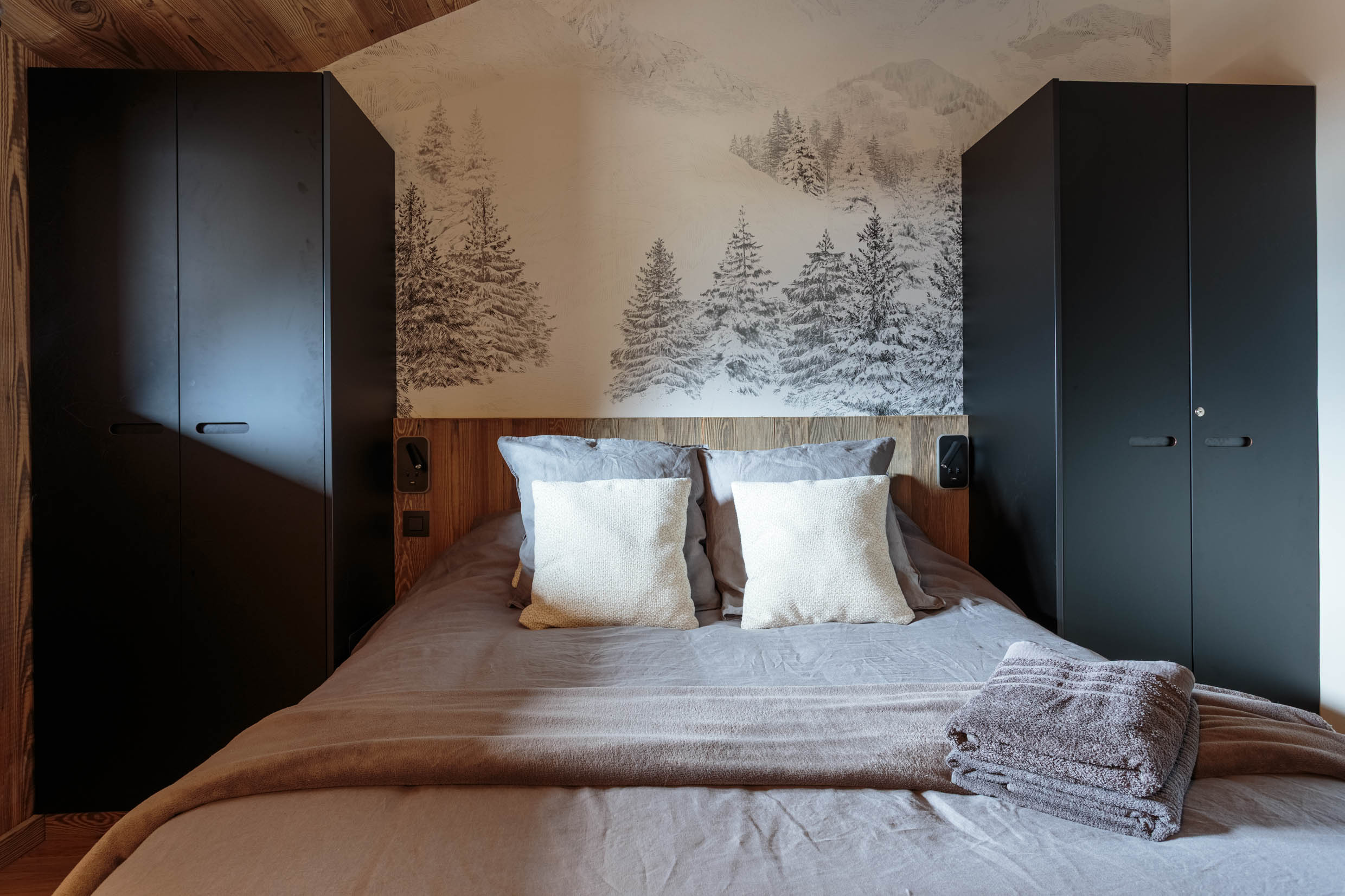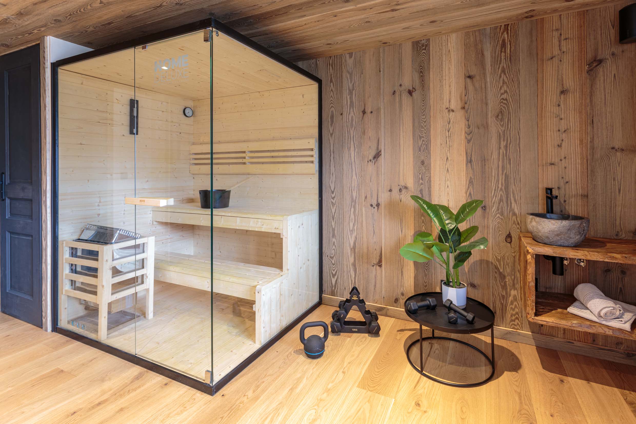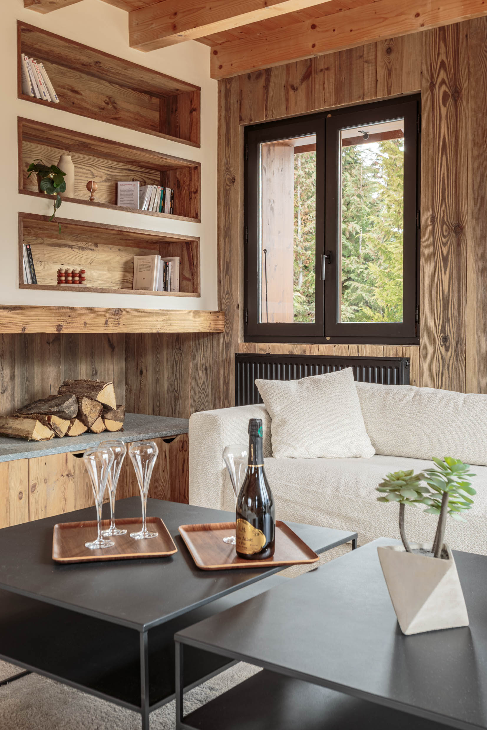 La reconfiguration des espaces redéfinit les usages du chalet. Cinq chambres, chacune accompagnée de sa salle de bains, offrent un confort intime et fluide. En complément, une salle TV, pensée comme un espace plus feutré, une pièce dédiée au bien-être avec sauna, ainsi qu’un skiroom fonctionnel viennent accompagner les rythmes de vie propres à la montagne.