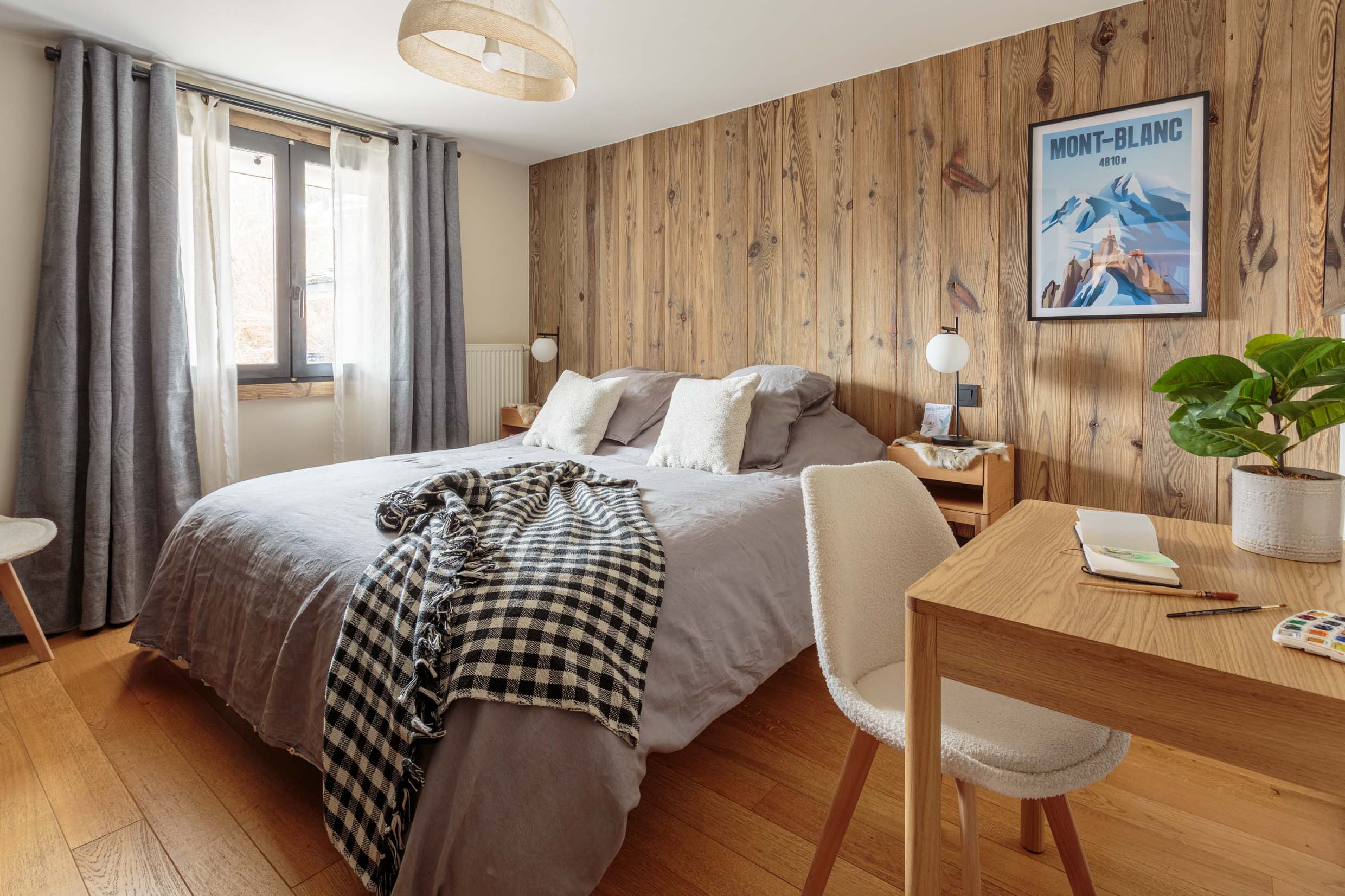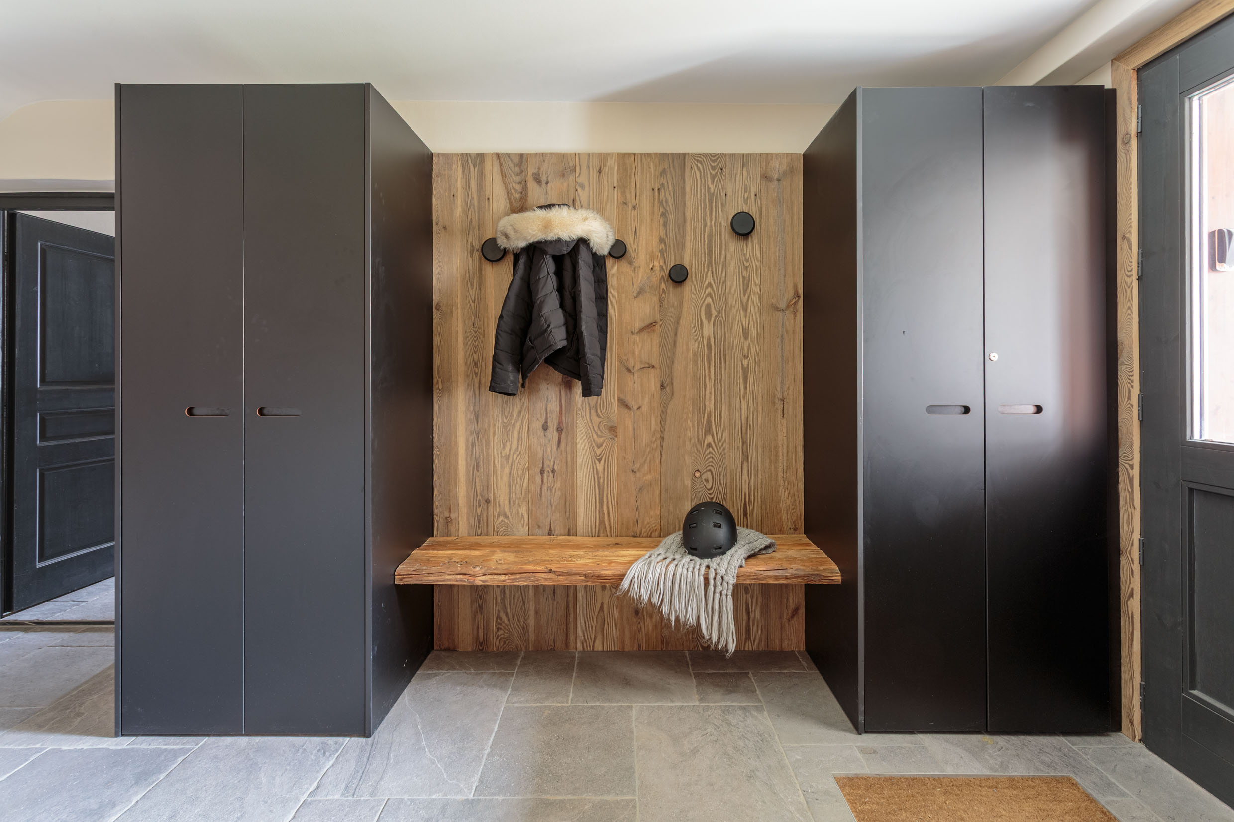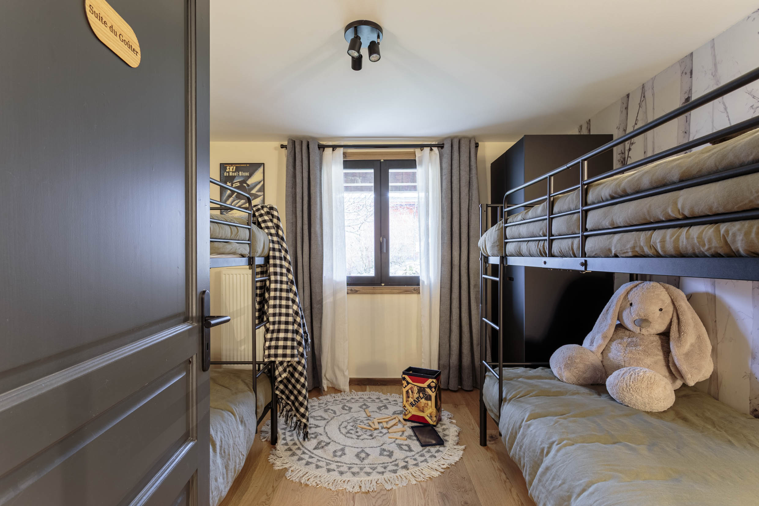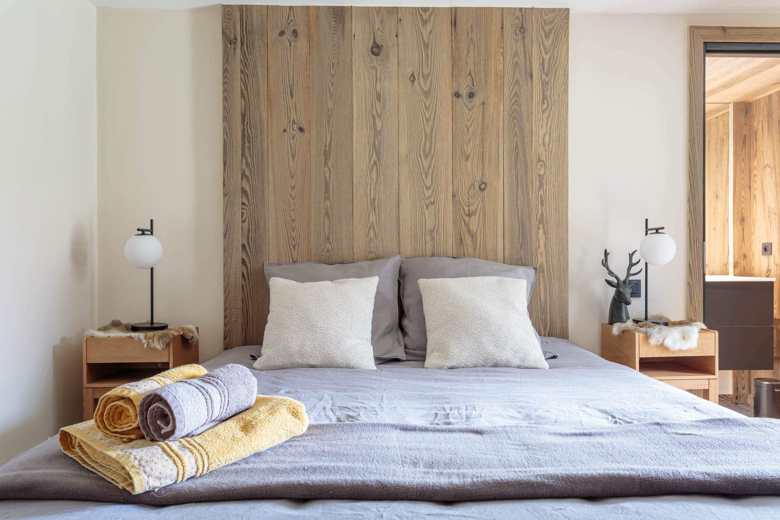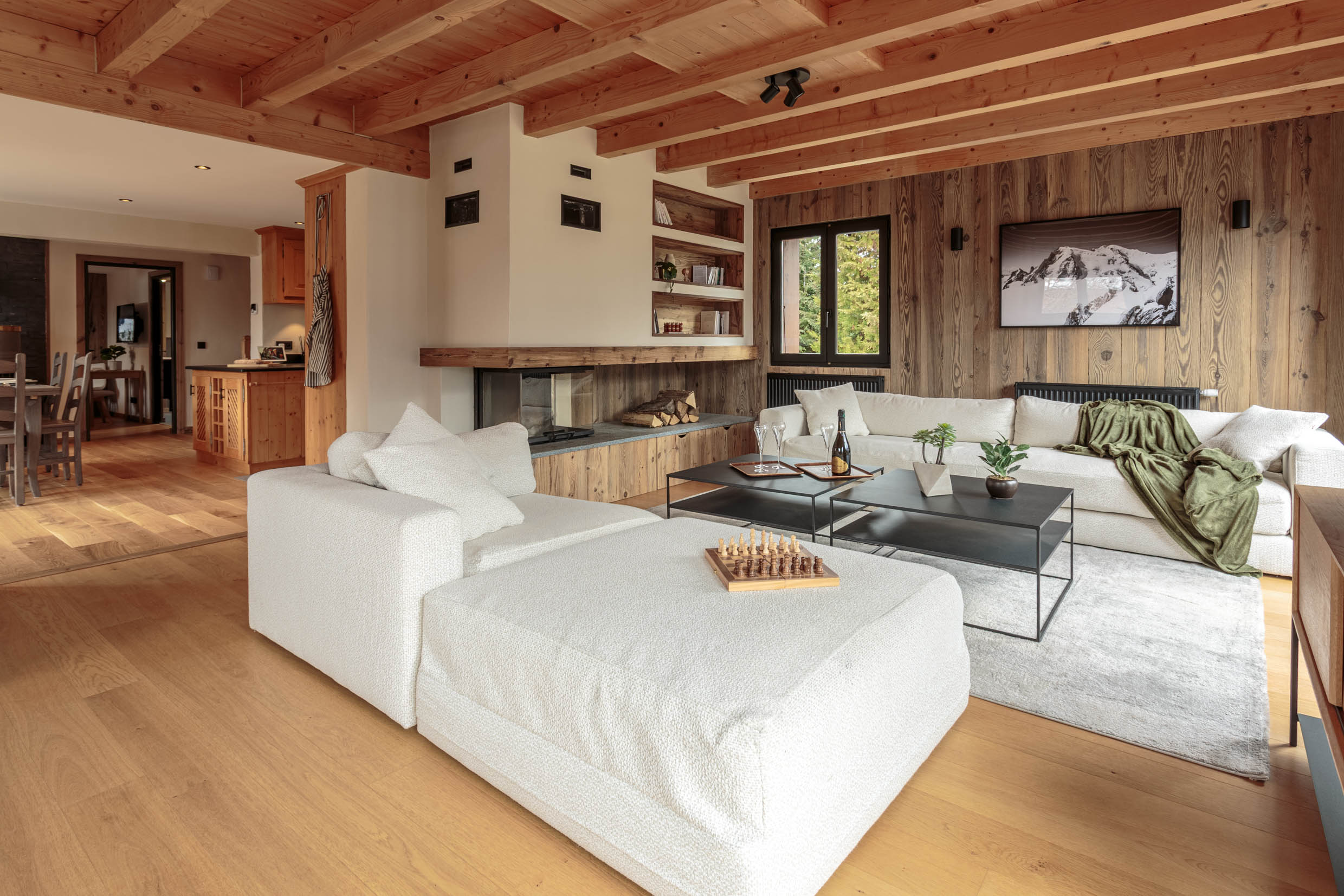 La reconfiguration des espaces redéfinit les usages du chalet. Cinq chambres, chacune accompagnée de sa salle de bains, offrent un confort intime et fluide. En complément, une salle TV, pensée comme un espace plus feutré, une pièce dédiée au bien-être avec sauna, ainsi qu’un skiroom fonctionnel viennent accompagner les rythmes de vie propres à la montagne.
