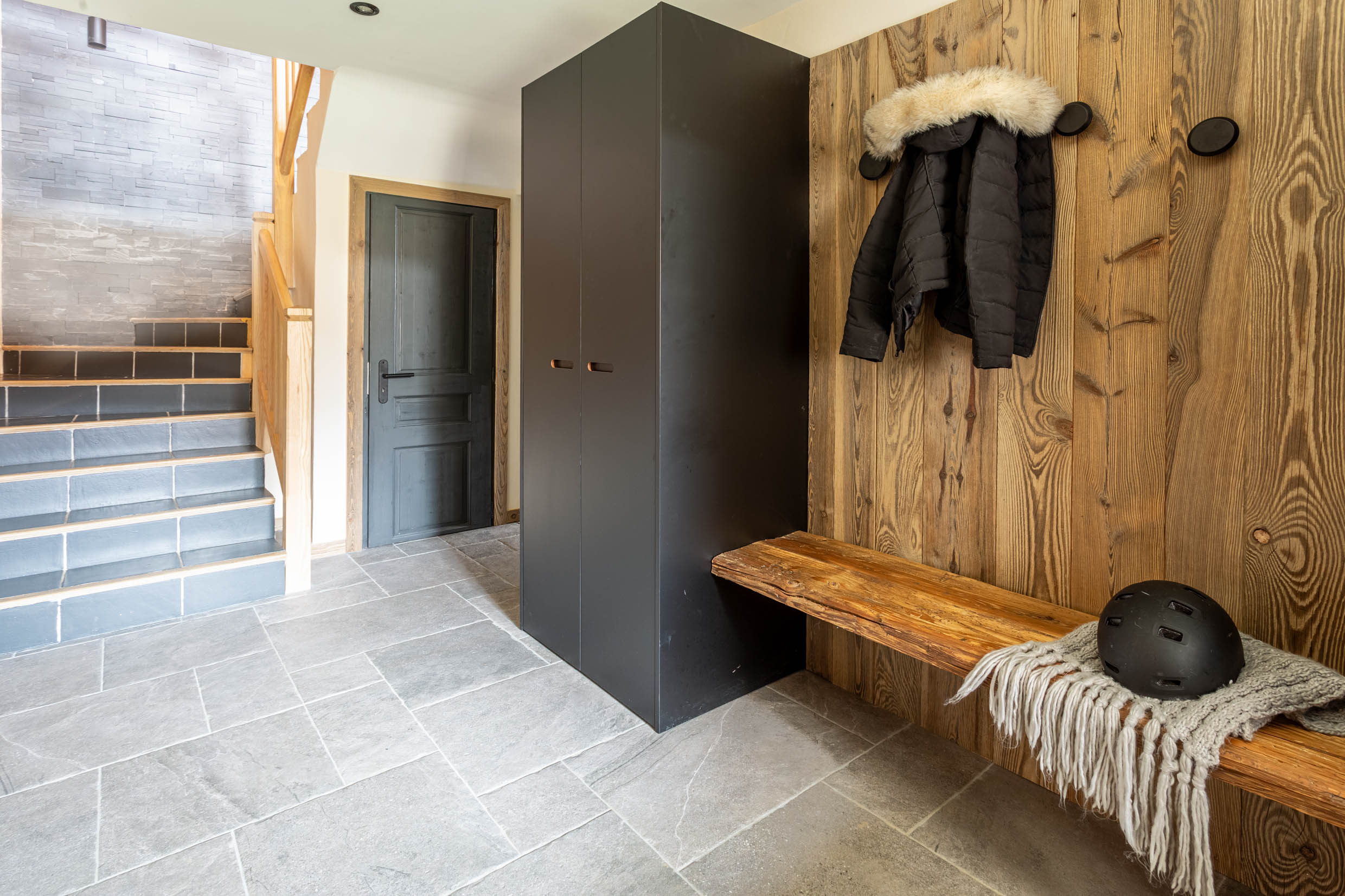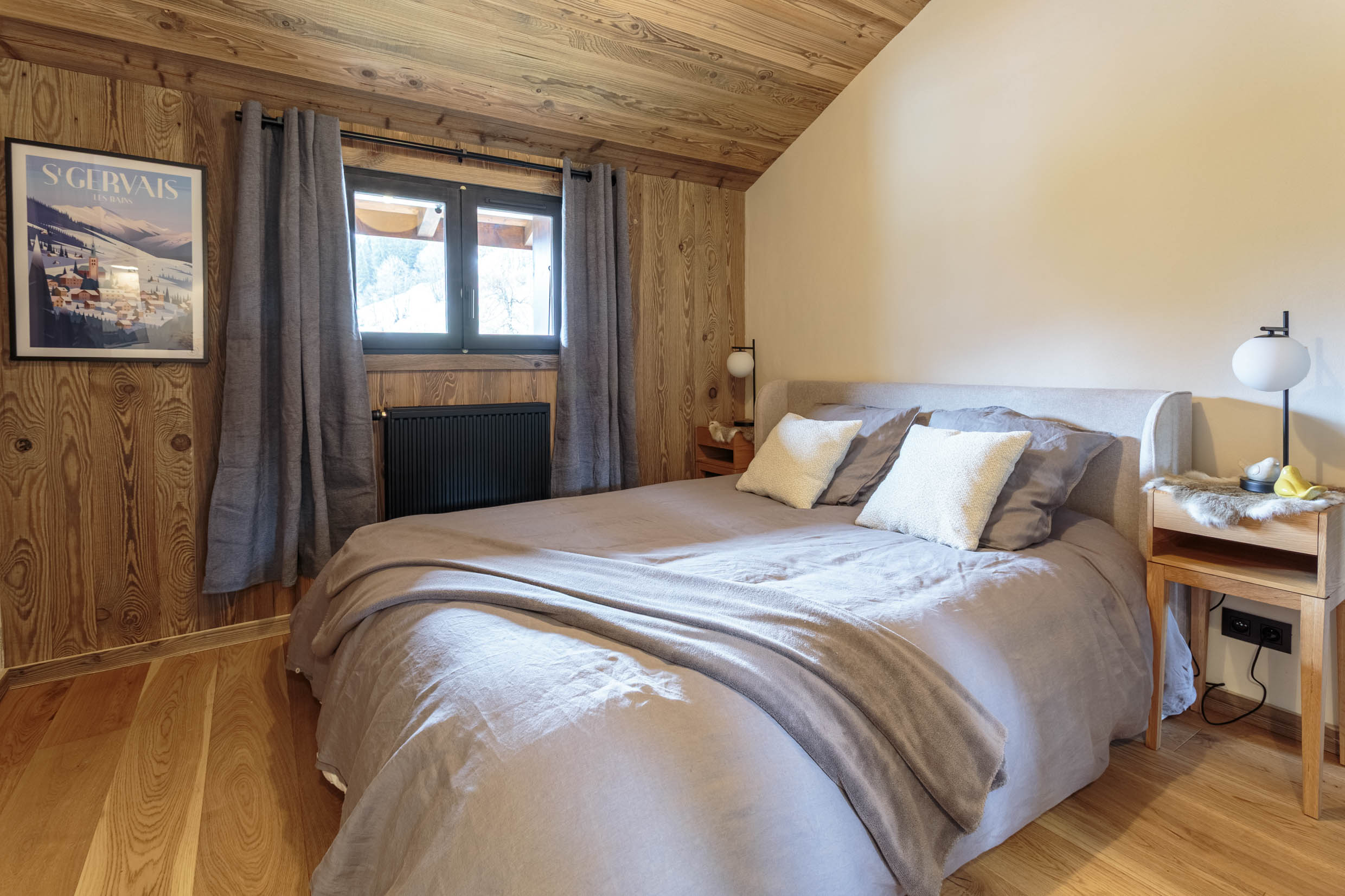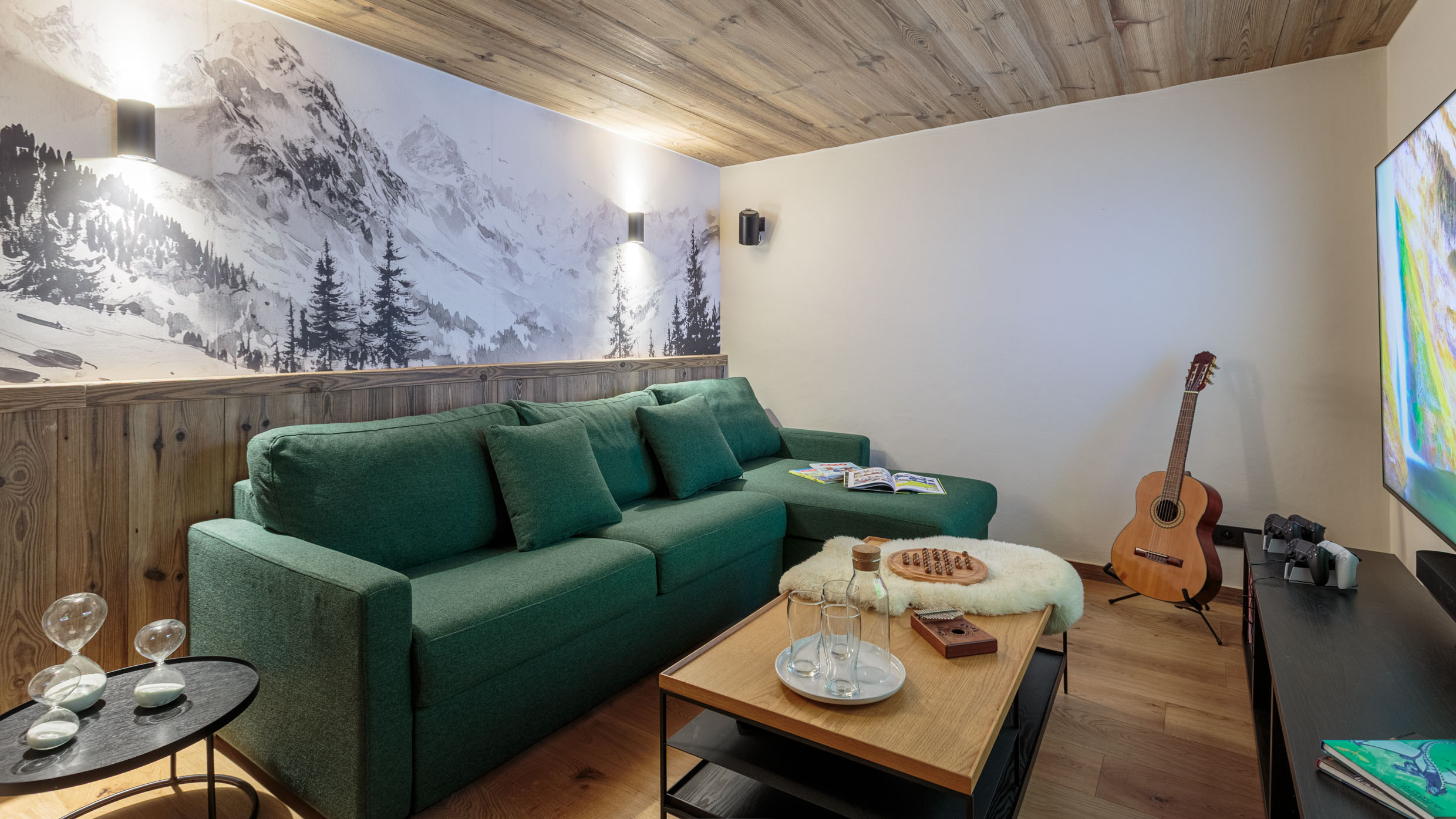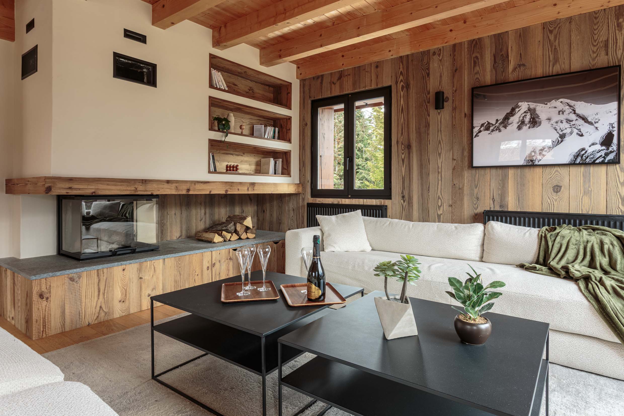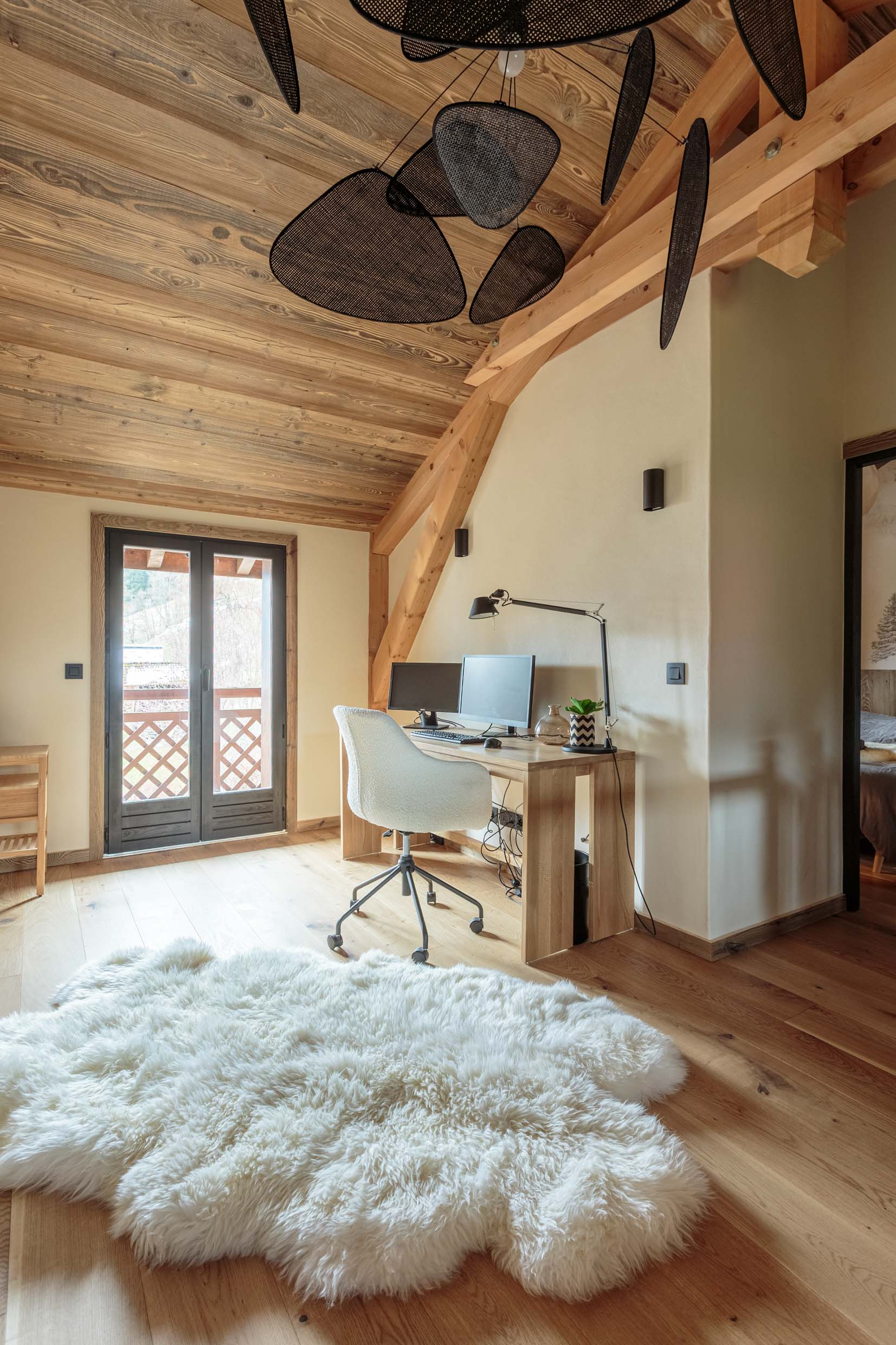 La reconfiguration des espaces redéfinit les usages du chalet. Cinq chambres, chacune accompagnée de sa salle de bains, offrent un confort intime et fluide. En complément, une salle TV, pensée comme un espace plus feutré, une pièce dédiée au bien-être avec sauna, ainsi qu’un skiroom fonctionnel viennent accompagner les rythmes de vie propres à la montagne.