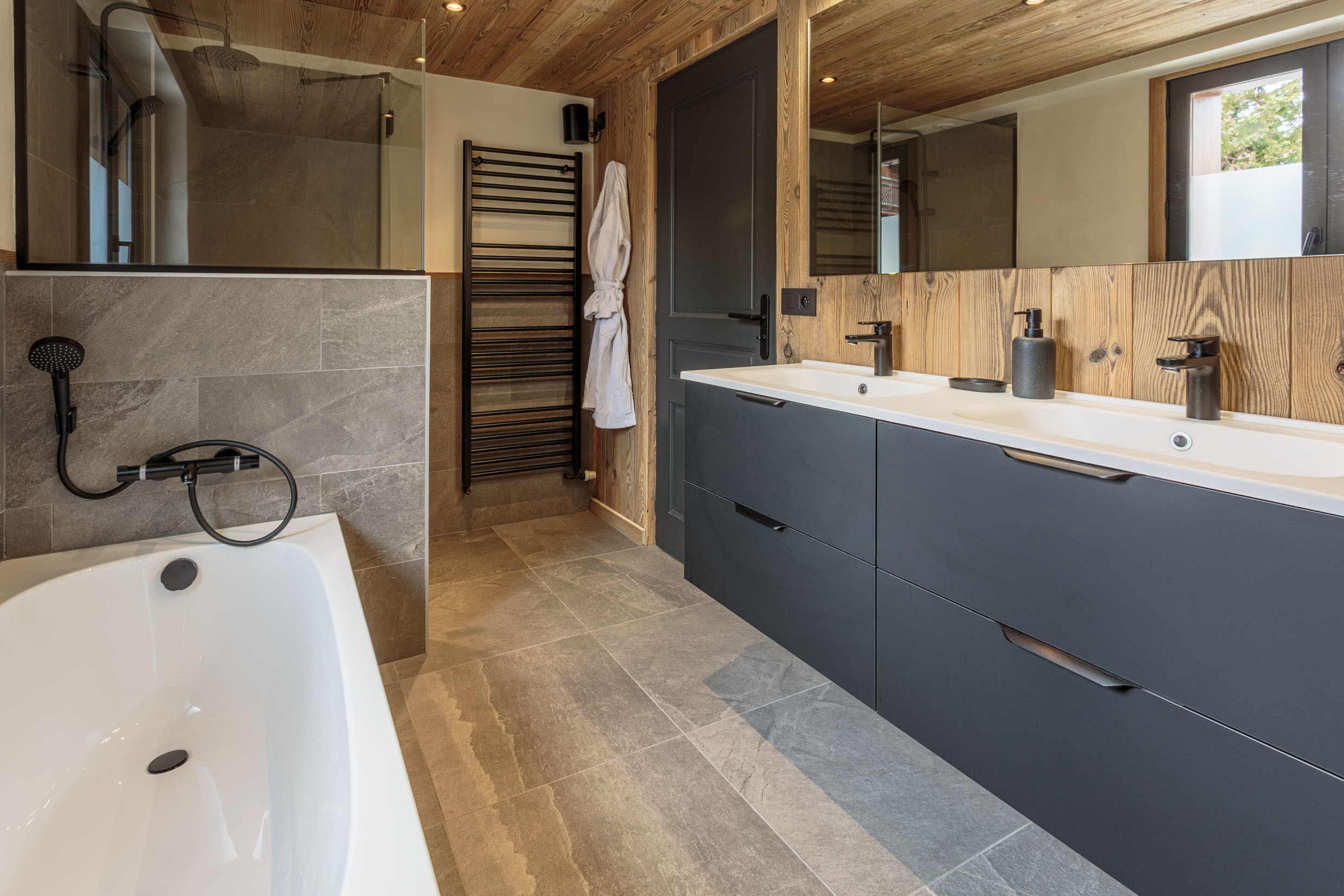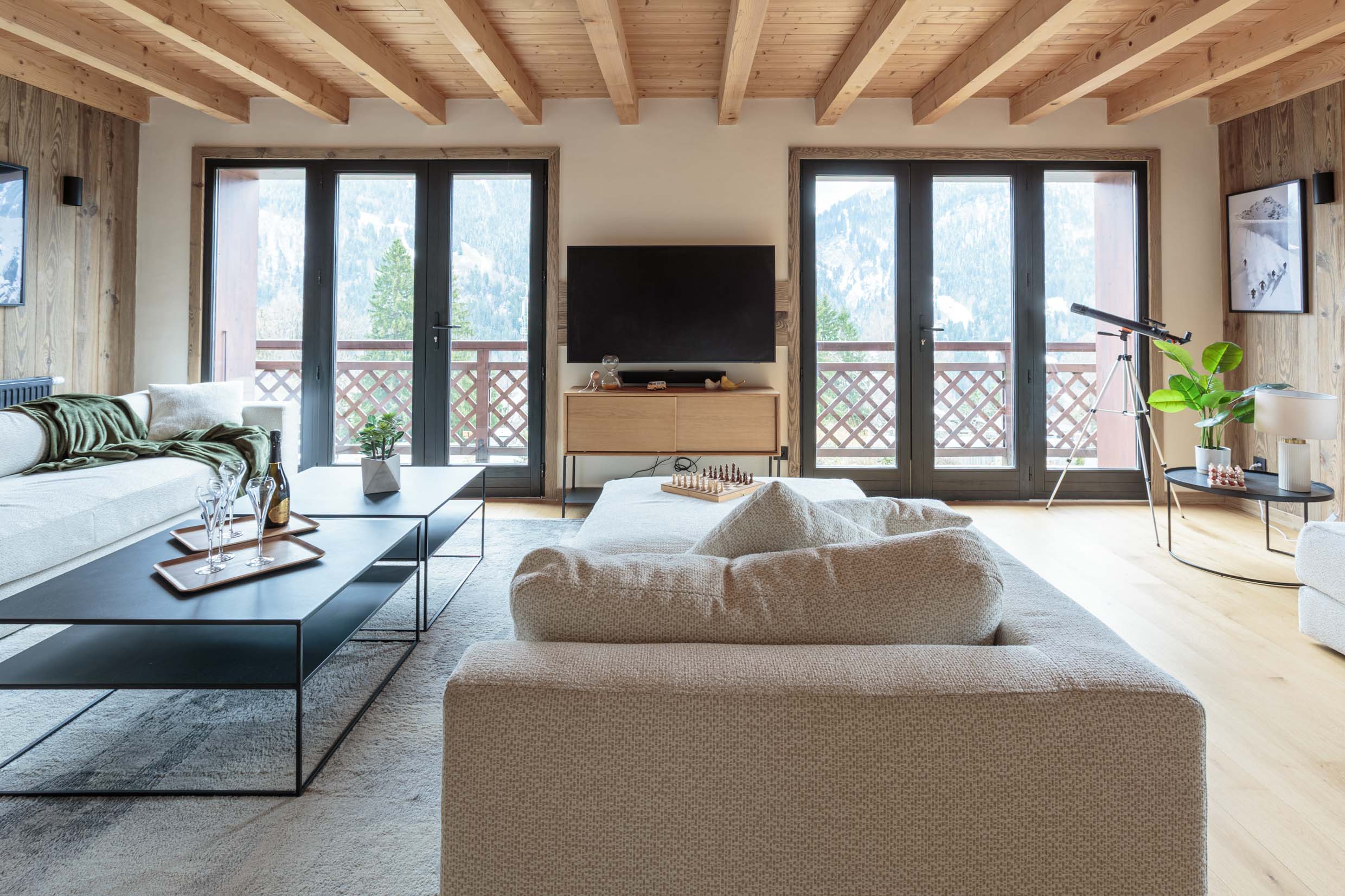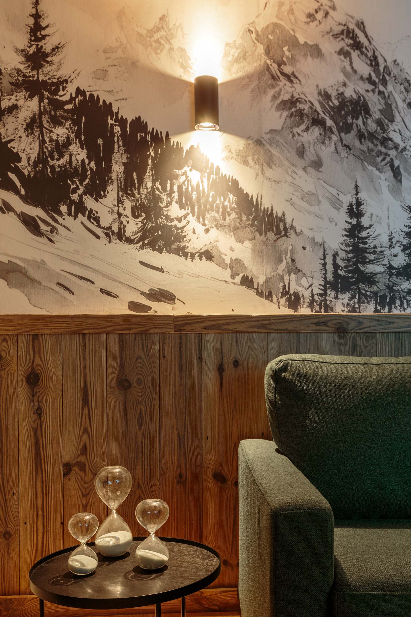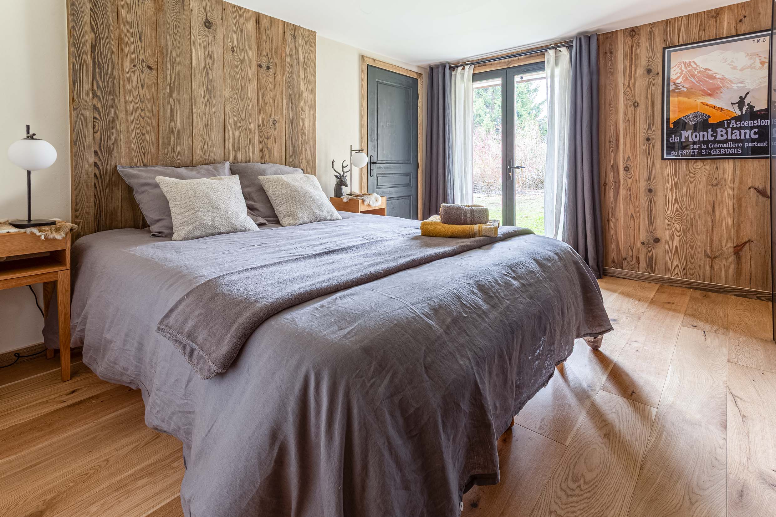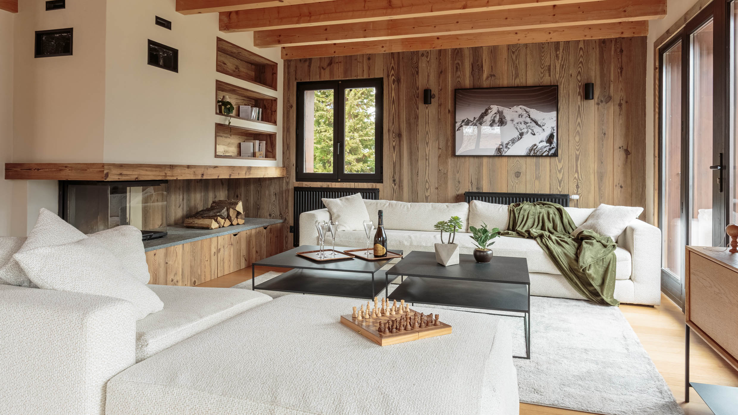 La reconfiguration des espaces redéfinit les usages du chalet. Cinq chambres, chacune accompagnée de sa salle de bains, offrent un confort intime et fluide. En complément, une salle TV, pensée comme un espace plus feutré, une pièce dédiée au bien-être avec sauna, ainsi qu’un skiroom fonctionnel viennent accompagner les rythmes de vie propres à la montagne.
